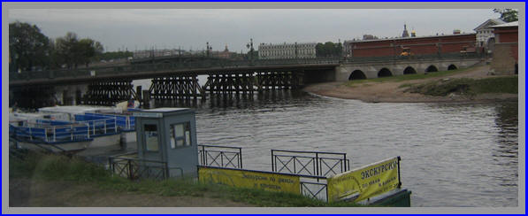 Alle bruggen over de Neva rivier gaan s-nachts open voor het doorgaande scheepvaart verkeer Een veerpontje onderhoud hier een oeververbinding gedurende de nachtelijke uren